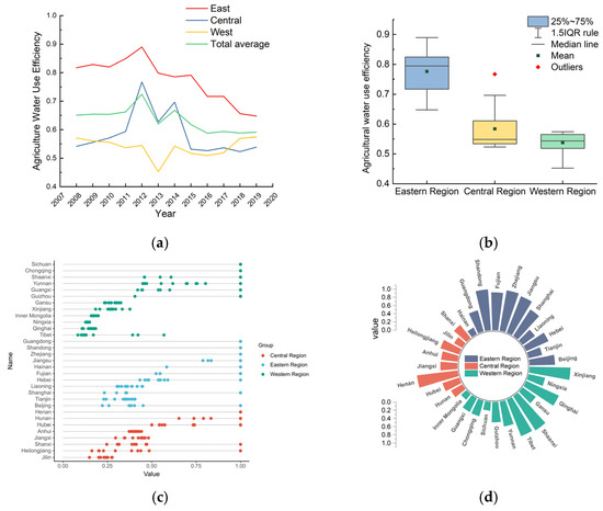 At the regional level (Figure 2a,b), there were obvious differences in AWUE in each region. The regional AWUE average from high to low was as follows: eastern, central, and western. From the perspective of temporal evolution, the overall AWUE in various regions has shown a fluctuating downward trend, and there is still great room for the improvement of AWUE. Specifically, from 2008 to 2019, AWUE in the eastern region was always ahead of the national average level, but showed a downward trend, and the efficiency value changed from 0.817 to 0.648. AWUE in the central region fluctuated greatly, and was lower than the national average in all years except for between 2012 and 2014. The overall level of AWUE in the western region was low, and the overall trend was to decline first and then rise.