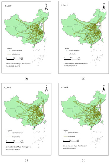 Based on the modified gravity model, the spatial association matrix was calculated. Subsequently, the spatial correlation network diagram of AWUE in China was drawn. Four years (2008, 2012, 2016, and 2019) were selected as representatives for horizontal comparison (Figure 3).