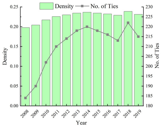 Network density can be used to measure the overall tightness of a network’s structure; it is calculated as the ratio of the number of connections in the network to the total number of possible connections [40]—the lower the network density, the worse the network connection. Equation (1) shows how to calculate network density: