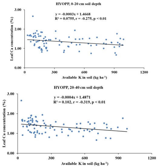 Relationships between available K (AK) in soils and leaf Ca concentration of high-yielding oil palm plantations (HYOPPs) and low-yielding oil palm plantations (LYOPPs).
