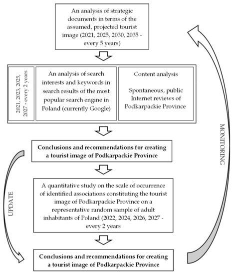 The project of the methodology of cyclical research into the tourist image of Podkarpackie Province, presented in this article, is an attempt to respond to the basic challenge of defining the image, with the pragmatic use of the widest possible range of methodological solutions. The presented algorithm of particular stages of activities reflects the outlined dichotomy—the institutionalized and strategy-managed image versus spontaneous, impulsive individual opinions, with regular evaluation of the current popular beliefs about the tourist assets of Podkarpackie Province (Figure 1).