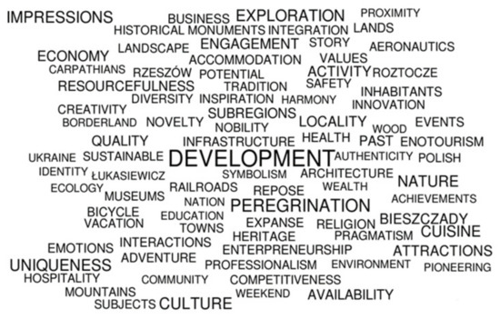 It is associated with dynamism, change, freshness and openness. It is certainly unique, providing special experiences—mainly related to the culture of this area. The whole region can be explored mainly while hiking. Its uniqueness is mainly manifested in the varied cuisine. Tourists also explore other attractions, not necessarily precisely indicated—it is rather an image-related issue. Locality and the Bieszczady are strongly interrelated. Activity, involvement and values are not without significance in the main image. The whole image is closed with ‘the past.’ Nature, wildlife and inhabitants come third. These carry the main image elements. This category of keywords also includes ‘bicycle’—another way to actively explore the varied area of the province.