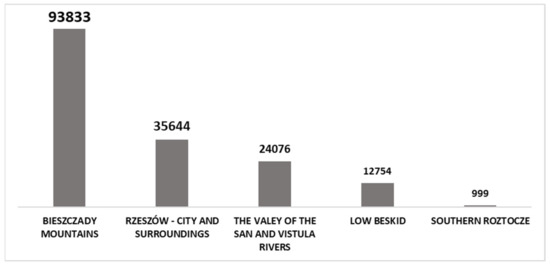 On the basis of the previously analysed strategic documents, Podkarpackie Province was divided into five tourist sub-regions, each offering different opportunities for travelling. Therefore, these 48 tourist attractions were assigned to individual sub-regions along with the number of reviews they received (Figure 3).