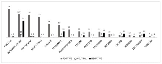 Frequency distribution of positive, neutral and negative reviews by topic in spontaneously generated internet content about tourist attractions of Podkarpackie Province.
