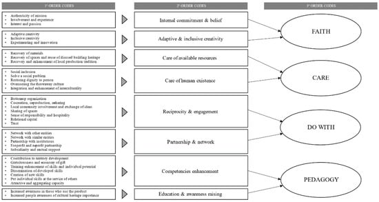 As mentioned in the theoretical background, hybrid organizations are organizational forms that combine a social and/or and environmental mission with a financial one [,]. Hybrid organizations contribute to sustainable development by implementing initiatives aimed at healing, preserving, and improving the world through the production of goods or the provisions of services. Such an aspect is summarized in the “care” construct, meant as the attitude to guard and watch over the natural environment and human beings [,]. Additionally, the ability of hybrid organizations to foster sustainable development is based on their ability to develop and maintain relationships with the surrounding organizational realities, as well as actively involve the local community. This aspect is summarized in the construct “do with,” meant as the attitude of hybrid organizations to collaborate and cooperate with individuals and groups of individuals []. At the same time, getting in touch with other socioeconomic actors allows the hybrid organization to educate and to be educated, sharing skills and competences. Such an aspect is summarized in the “pedagogy” construct, meant as the attitude of hybrid organizations to educate, spread knowledge, and ennoble the human essence. However, such partnering and pedagogical aspects lead the hybrid organization to have to deal with a variety of criticalities. Among these challenges is that of remaining faithful to one’s threefold mission (social, environmental, financial) over time. Such an aspect is summarized in the construct of “faith,” meant as a profound adherence to one’s threefold mission. Only thanks to “faith” can hybrid organizations balance the multiple missions and logics they embody. Indeed, faith awakens an individual’s critical sense [] and balances the conflicting tensions by preventing one logic’s prevalence over another one.