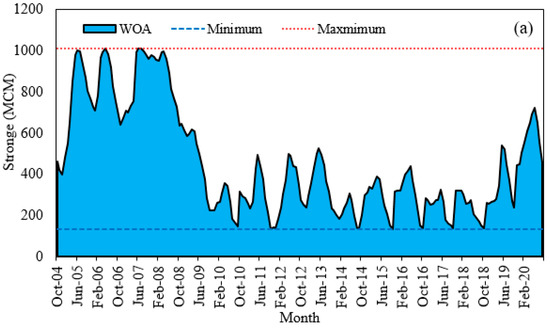 When allocating surface water resources from dams and groundwater resources, the remaining volume of reservoirs should always be considered. In other words, the allocations should be such that surface and groundwater resources are not damaged. Therefore, the volume of resources was calculated after allocating the amounts in each month. One of the constraints of the optimization model was that the allocation of the reservoir should not be more than the capacity of the water supply channel, and the other was the continuity equation. Figure 6 shows the changes in the reservoir volume after allocating the amount of surface water in each month. The reservoir volume has always varied between its maximum (1030 MCM) and minimum (133 MCM) capacity (Figure 9a).