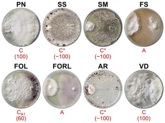 MX95 reached an average IRG of 40.8% and was effective to inhibit the growth of FOL and PN, while was less effective against AR (Figure 6). ALPO, showing an average IRG of 56.3%, had a strong inhibitory capacity towards SM, SS and AR, while it was less effective against FORL (Figure 6). AL142PE showed a high efficacy to contrast AR, VD, SS and FS and achieved an average IRG of 53.1% (Figure 6).