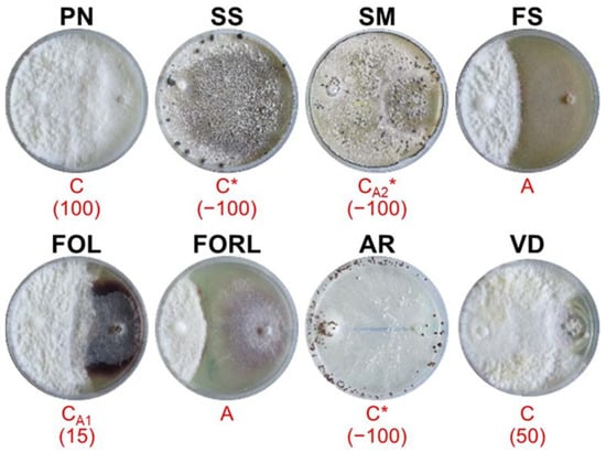 MX95 (Figure 3) showed deadlock after mycelial contact during the interactions with FOL and FORL, while deadlock at a distance was exhibited with VD. MX95 completely over-grew (OA = 100%) SM and PN, while it partially grew on FS (OA = 40%) and SS (OA = 10%). AR in part replaced MX95.