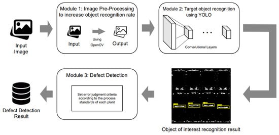 The captured input image is (1) pre-processed using OpenCV [,], and (2) pre-learned YOLO is applied to recognize the target object of the image. After extracting the ROI, the region of interest of the object, using the information on the extracted region, (3) an error is detected according to the error determination standard that meets the process standard of each factory set in advance. Through this model, it is possible to minimize the economic and technical burden of a small factory by allowing the model to be used to find any defects that can detect only with images taken from the outside without a scale or additional equipment.
