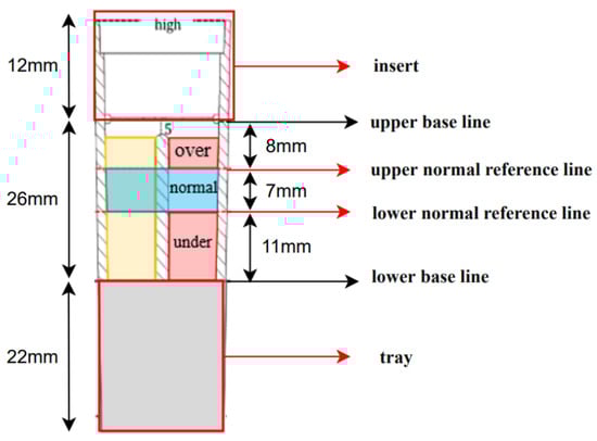 The volume of liquefied gas in the translucent fuel tank can be classified as over, under, and tiny. Tiny refers to a case in which the gas surface cannot be recognized because the amount of gas is too small for the camera to identify the surface of the liquefied gas. To correctly determine whether the various amounts of gas are defective, the validity of the indirectly measured volume and the established normal standard must be secured. Figure 6 shows the calculation of the normal area using the length of each part of the gas lighter measured using a measuring device.