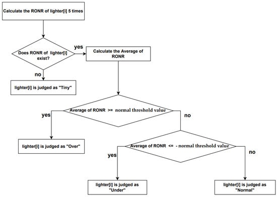 Figure 7 shows the method of calculating the Rate of Out of Normal Range to objectively determine whether the detected liquefied gas surface is located at the upper or lower reference line. When the bounding box created by recognizing the surface exceeds the upper or lower reference line, the ratio of the exceeded height h’ to the box height h is called Rate of Out of Normal Range, and in this paper, it was called RONR. Figure 8 shows the flow chart of the judging algorithm using the calculated RONR. In this system, the n-th lighter is judged k times, and if the average value of the k RONR exceeds the normal threshold, the n-th lighter is judged as an over- or under-defective product. The size of the bounding box of the surface recognition is recognized as thicker than the actual surface for reasons, such as shaking or surface tension. Therefore, in this paper, the normal threshold value was set to 90% to detect only the defect.
