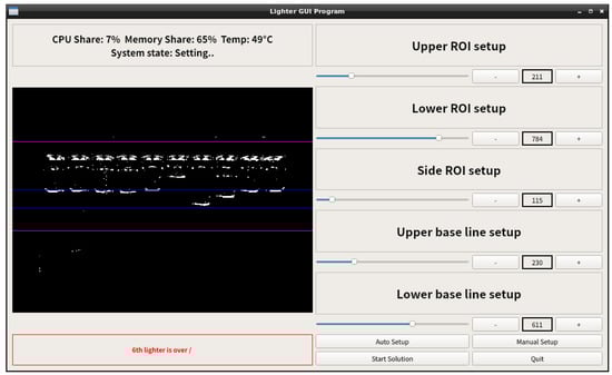 Since a set of lighters moves in front of the camera every 1.5 seconds to take an image, to detect defects using the system in an actual factory, defect detection must be completed within 1.5 seconds. In the 2500 additional processing time experiments conducted for processing speed analysis, the maximum value was 1.348 seconds, the minimum value was 0.886 seconds, the average was 0.904 seconds, and the standard deviation was 0.028 seconds, so it could be recognized within 1.5 seconds in all experiments. Additionally, in an actual program, if there is a defective lighter for a lighter set, the number of the defective lighter and the defective condition is output, as shown in Figure 11 below.