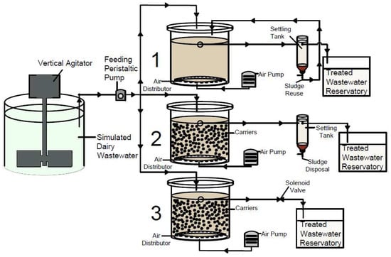 Schematic representation of the laboratory AS (1), MBBR (2), and SBMBBR (3) synthetic dairy wastewater treatment.
