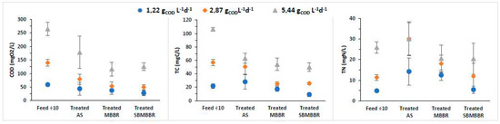 A comparison of the removal efficiencies of TC, TN, and COD was performed for AS, MBBR, and SBMBBR regarding the influence of the system design on biosolids production and removal performance to understand how different loading rates would affect the reactors’ individual efficiency. In Figure 2, the average removal efficiencies for soluble COD, TC, and TN are presented with their associated standard deviation. The SBMBBR stands out as the most efficient for the tested parameters of the three studied systems at an OLR of 1.22 mgCOD L−1d−1.