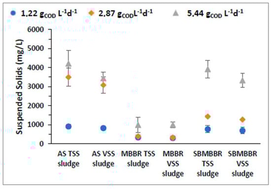 MLSS monitorization is an integral part of the AS system as sludge management is key to optimizing operational conditions of the process, impacting energy consumption, performance, and sludge disposal costs in a wastewater treatment facility [51]. In this regard, the MBBR strongly reduces sludge production. It reduced up to 88.9% TSS than AS and 72.8% less than the SBMBBR. For a better understanding and evaluation, a comparison of TSS and VSS values between the MLSS of the three reactors is presented in Table 3. One can perceive that AS is the system that produces a higher quantity of sludge, while the MBBR system highly reduces sludge production. The SBMBBR offers higher treatment as well as reduced sludge production when compared with the conventional activated sludge process. The MBBR has the lowest concentration of suspended solids (SS) and, despite having removal efficiencies higher than AS, it is behind the SBMBBR for OLRs of 1.22 and 2.87 gCOD L−1d−1. Despite having a higher concentration of SS, the AS system had the worst treatment efficiencies regarding all the studied parameters, which stresses the carrier’s role in biodegradation and denitrification.