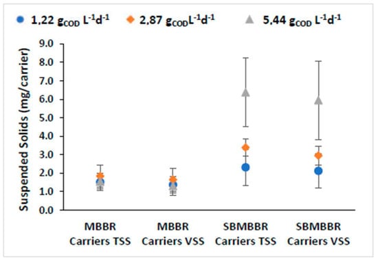 The amount of attached solids per surface is crucial when discussing moving-bed wastewater treatment plants [53]. The mass attached to the carrier depends on the wastewater composition, operating conditions, and the organic loading rates [52,54]. A biofilm consists of cells aggregated and embedded within a matrix of EPS (extracellular polymeric substances). EPS are crucial for providing stability and adherence of the biofilm to carriers in the MBBR [29]. Bacteria growing in biofilm cells own increased stability when compared to freely suspended cells, concerning variations in the influent composition and abrupt changes in load, temperature, and toxicity. Therefore, biofilm increases the potential for removing pollutants, mainly due to the wide variety of microbial functional groups present in these environments [26]. For this reason, biofilms should be more resilient to mechanical instability and organic loads variations and be able to reduce hydraulic retention time. Additionally, the installation and operation costs are reduced due to the lower volume of sludge produced. The former means that the bacteria adhering to the carriers effectively degrade the organic compounds, even at low concentrations of suspended solids. This way, the higher biofilm activity obtained should increase compounds’ biodegradation and the system’s overall efficiency while decreasing treatment costs. In fact, the development of anoxic zones in the biofilm suits the moving-bed carriers, as it promotes the growth of anaerobic organisms capable of nutrient removal [55]. The TSS and VSS carriers’ mass for the MBBR and SBMBBR is presented in Figure 4.