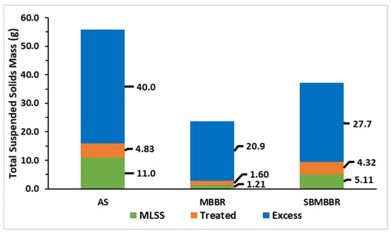 From these results, it is possible to observe that the AS system produces a greater amount of suspended solids, as it sums up to 55.8 g of TSS. On the other hand, the MBBR produced 23.7 g having the lowest amount of biomass, while the SBMBBR placed in between AS and MBRR produced a total of 37.2 g of TSS. The higher sludge amount in AS can be associated with sludge recirculation. Since the MBBR and SBMBBR did not have this system in place, the suspended sludge accumulation was lower. It is also understandable that the settling tank after the MBBR system helped to keep sludge in the effluent lower. On the other hand, if the solids inside the SBMBBR system do not settle and compact properly, part of the solids can come out of the reactor during the decantation phase. As described by Rusten et al. [33], suspended sludge in the MBBR is highly dependent on the OLR, with suspended solids concentration varying from below 10 to above 500 g m−3. Higher organic loads increased SS, but COD efficiency was highly affected, especially for HRT lower than 8 h. A volumetric organic load of 500 gCOD m−3 h−1 and of 900 gCOD m−3 h−1 reached 85% and 60% COD removal, respectively. Aygun et al. [55] observed a sludge production of 0.35 gTSS d−1 for about 2.85 gCOD d−1. In an SBR-type reactor, the sludge production is hindered by the anoxic phase, resulting in a biomass decay rate, when compared to fully aerated SBRs [48].