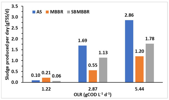 Sludge produced per day (gTSS d-1) for each type of bioreactor and different OLRs.