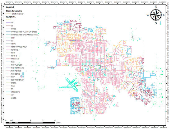 Pipe material also plays an essential role in the resiliency of stormwater pipes. There were many kinds of materials in the stormwater pipelines of the City of Regina, such as PVC, CSP, AC, Steel, RCP, CONC, and TILE. Figure 4 shows different materials used in the pipes of the City of Regina, identified with different colors.