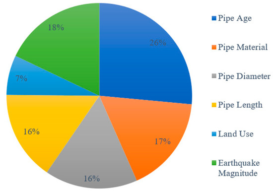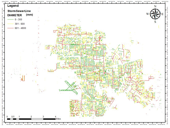 The pipe diameter and length were employed to determine the flow through the pipes. The larger the pipe it is, the more flow capacity will have. For the higher capacity, larger pipes will have a higher possible consequence if a pipe breaks. Pipe diameter (mm) is categorized into small (excellent), medium (moderate), and large (poor). Figure 5 shows pipe diameter variation, indicated with different colors, in the City of Regina. In Figure 5, the greener the pipe, the smaller the pipe’s diameter. On the other hand, the redder the pipe is color red, the larger the pipe’s diameter.
