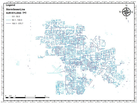 The pipe length was assessed by m, and they are ranked by experts into small (excellent), medium (moderate), and large (poor) scales. Figure 6 illustrates the differences between pipe lengths in the City of Regina stormwater pipe system. It was obtained from ArcMap, properties, Symbology section. The more dark-blue the color of the pipe, the larger the length, and the more it tends to light blue, the smaller the pipe is in length.