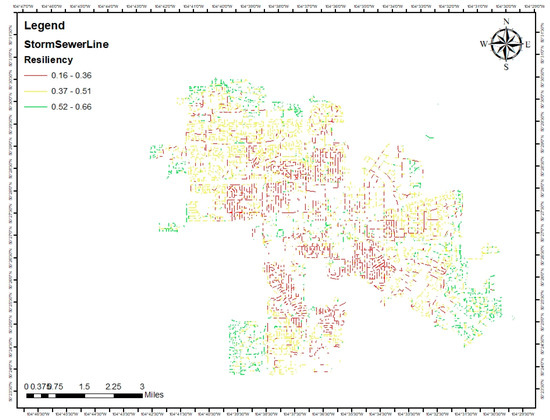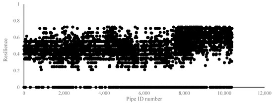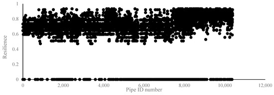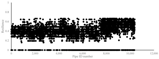 Another scenario for the recovery factor’s inputs is considered. If the degree of damage becomes excellent (low) (means there will be no damage in the pipes), it is important to see how it will affect the maximum resiliency. With calculations, in this case, the maximum resiliency will be 0.934, which shows the high importance of changing the degree of damage. The degree of damage is a vital factor in our study as it has a high value in weights based on experts’ opinions. Figure 13 shows the resilience values for all of the pipes in the City of Regina’s Stormwater pipe system after changing the value of the degree of damage to Excellent.
