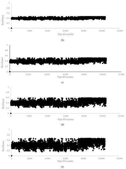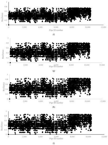 The following subsections shows the detail of these nine assumptions. More assumptions were checked to validate the robustness of the proposed model, but were not included because of the space restriction. For instance, Assumption 1 was to consider reliability weight equal 0.1 and the recovery weight equal 0.9. The resiliency figure for all the pipes is shown in Figure 15a. The average resiliency for the whole system became 0.392 in this case. Assumption 3 was to consider reliability weight equal to 0.3 and recovery weight equal to 0.7. The resiliency figure for all the pipes is illustrated in Figure 15c. The average resiliency for the whole system became 0.404 in this case. Assumption 6 was to consider Reliability weight equal to 0.6 and recovery weight equal 0.4. The resiliency figure for all the pipes is shown in Figure 15f for this assumption. The average resiliency for the whole system became 0.449 in this case. Assumption 9 was to consider reliability weight equal to 0.9 and recovery weight equal 0.1. The resiliency figure for all the pipes is shown in Figure 15i for this assumption. The average resiliency for the whole system became 0.486 in this case.