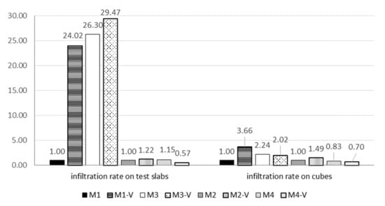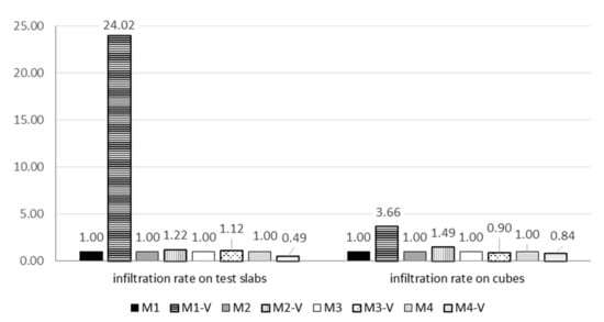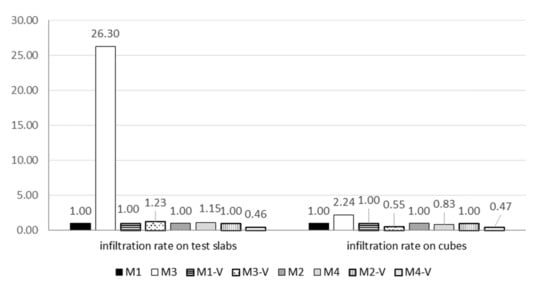 | Infiltration rate on cubes [mm/s] | 3.20 | 11.73 | 17.32 | 25.81 | 7.18 | 6.48 | 14.45 | 12.08 |