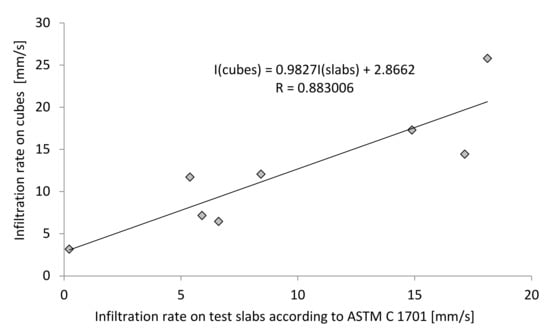 - This paper presents a linear equation to correlate the infiltration rate on test slabs and the infiltration rate on cubes, in order to correctly predict the field hydraulic behavior of a pervious concrete mixture;