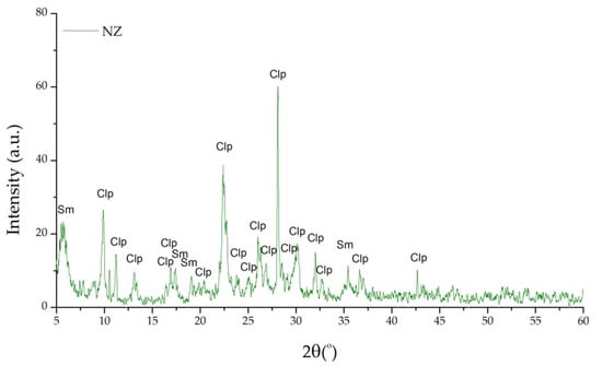 The diffraction pattern of the NZ is presented in Figure 1. According to the obtained results, NZ consists mainly of clinoptilolite (type of natural zeolite mineral) and smectite (known as “swelling” or “expandable” clay mineral). The presence of smectite in zeolite tuff, as a secondary component, can affect the properties of fresh and hardened NZ blended cement composites [24].