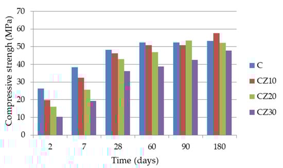 Although the compressive strengths of CZ30 were always lower than their corresponding reference values, an upward trend over time can be noticed, i.e., the difference between its compressive strength and the corresponding reference value decreased by 26%, 19%, and 10%, at the ages of 60, 90 and 180 days, respectively.