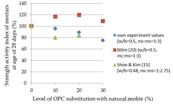 Based on the obtained experimental results, the recommended level of substitution of OPC with NZ, regarding the long-term compressive strength (from 60 to 180 days), is up to 20%, and that is in accordance with the results reported by Jana [41], indicating that the optimal compressive strength of mortars with NZ as an SCM can be achieved (up to 56 days) within the range of 10–20% OPC substitution with NZ. Furthermore, Bilim [20] found that the mortars containing up to 30% clinoptilolite exhibited comparable or higher strength results compared to the control mixture at all curing times (up to 90 days). Furthermore, Shon and Kim [15] reported that the mixtures containing 10 and 20% NZ showed a slower strength development up to 56 days curing period but exceeded the strength of reference mixture at 91 days. Considering that Bilim [20], as well as Shon and Kim [15], examined the compressive strength of NZ blended mortar prisms with dimensions 40 mm × 40 mm × 160 mm, made with CEM I 42.5R (water to binder ratio of 0.5) and ASTM Type I Portland cement (water to binder ratio of 0.48), respectively, their results of strength activity index after 28 days alongside the results obtained in our own experimental research are presented in Figure 3. It can be noticed that the obtained results correspond to those reported by the other authors [15,20].