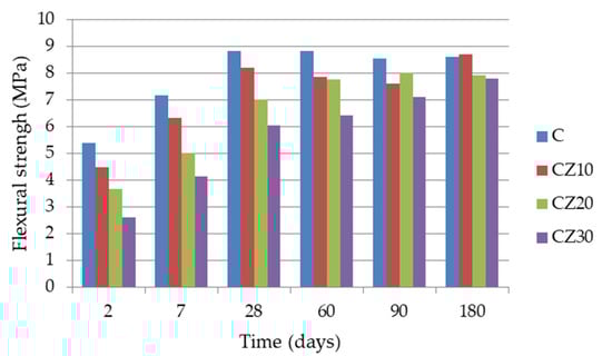 Although the flexural strengths of CZ20 and CZ30 were always lower than the values of their reference ones, an upward trend over time can be noticed. After 28, 60 and 90 days, the relative flexural strengths of CZ20 were lower by 21%, 12% and 6%, respectively, while they remained at the same level thereafter. Furthermore, the difference between the flexural strengths of CZ30 and their corresponding reference values decreased by 32%, 27%, 17% and 9%, at the ages of 28, 60, 90 and 180 days, respectively.