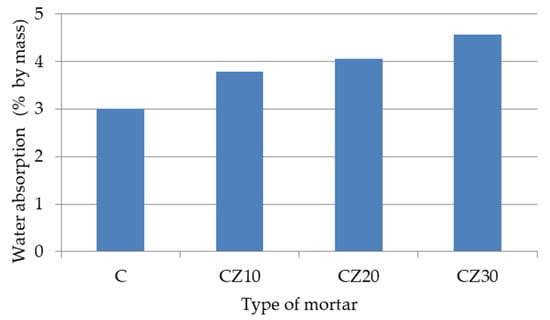 The most likely causes of good frost resistance detected in CZ10 are good strength values and the ability of the NZ pore structure to absorb the extra amount of water found in the material [18] at the points where the saturation with water is achieved, i.e., the “pumping effect”. If the over-saturation does not exist, the possibility of the specimen damage during freeze–thaw cycles will be minimized. Furthermore, it can be noticed that among the examined NZ blended cement mortars, the one with 10% NZ had the lowest value of capillary water absorption coefficient.