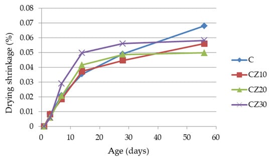 The evaluation of the effect of NZ on drying shrinkage dilatations was carried out on standard mortar specimens. The obtained results are presented in Figure 9. As it can be seen, the application of NZ as an SCM in blended cement mortars led to a decrease in drying shrinkage, especially at later ages. At the age of 28 days, the drying shrinkage of CZ10 and CZ20 was slightly lower or similar to that of the reference mortar, C, respectively, while it was higher for CZ30. After 56 days, the highest shrinkage value was registered for the reference mortar and the lowest one for CZ20. As reported by Najimi et al. [22], NZ as a porous material absorbs water in a fresh state. Later on, water could be gradually released and transported out of the NZ structure during drying through the hardening process. This presents a positive influence of the NZ structure on drying shrinkage. However, the presence of smectite as a secondary mineral phase in zeolite tuff, which may swell due to its interlayer absorption, could adversely affect this mortar performance. This finding is consistent with that of Norvell et al. [40], who determined that smectite (montmorillonite) clay significantly increases drying shrinkage.