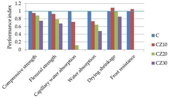Based on the compressive strength, flexural strength, capillary water absorption, water absorption at atmospheric pressure, drying shrinkage and frost resistance test results, performance indexes were calculated for each type of the tested mortar. The obtained results are presented in Figure 10 (Note: since the index value referring to capillary water absorption obtained for the CZ30 mortar was negative, it was adopted to be 0).