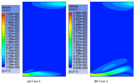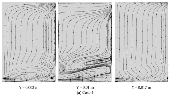The velocity field of the four cases at the cross-section of Y = 0.01 m is shown in Figure 13. In Cases 2 and 6, the supply water stream at a smaller velocity absorbs a larger amount of thermal energy and is heated to a higher temperature. Under such condition, the velocity field is dominated by buoyancy-driven flow, and the streamline is evenly distributed, as shown in Figure 13a,b.