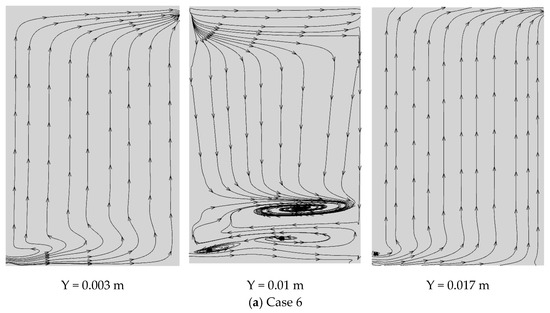 In all four cases, an inlet vortex is observed at the bottom of the window cavity. However, differences in streamline distribution are also observed. As shown in Figure 14a,b, the streamlines at the cross-sections of Y = 0.003 m and Y = 0.017 m show a uniformly upward flow. This is because the water stream near the glazing surfaces is heated to a higher temperature after absorbing thermal energy from the indoor and outdoor environments. It then flows upward under the buoyancy-driven force. However, in Case 6, the streamline shows a downward flow at Y = 0.01 m, and additional vortices appear at the bottom. This is caused by the larger temperature difference between the fluid near the glazing surface and in the middle. For Cases 7 and 8, affected by the high-velocity incoming flow, forced flow is dominant, and the streamline is partly disordered. As the water flow velocity increases, the inlet vortex increases accordingly. The formation of the vortex will unfavorably affect heat transfer and thermal removal.