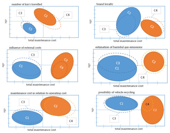 In addition, a brief, simplified graphic display of each indicator has been introduced in Figure 2, to provide a visualization of the clustering results, when compared with age and total maintenance costs (C1 and C3 display clusters defining the active-use phase of the life cycle, in the case of passenger vehicles and commercial vehicles, respectively, C2 and C4 display clusters defining the end-of-life phase of the life cycle, in the case of passenger and commercial vehicles, respectively).