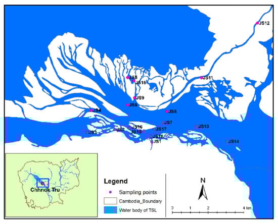 This study was conducted in Chhnok Tru floating village, TSL. The climate in the study area is characterized by wet and dry seasons. The long rainy season of the southwest monsoon lasts from May to October, and the dry season of the northeast monsoon lasts from November to April [19]. Water samples were collected at 18 sites in Chhnok Tru village in the dry and wet seasons under different conditions: before moving the floating houses and after moving the floating houses. Before moving the floating houses, sampling and water quality monitoring was performed on 7 June 2017 for the wet season. On the sampling day, the rainfall was 6.693 mm, and the minimum, average, and maximum air temperatures were 26.78 °C, 29.55 °C, and 32.50 °C, respectively. Sampling was performed again on 6 April 2018 for the dry season. The rainfall was 4.93 mm, and the minimum, average, and maximum air temperatures were 26.07 °C, 29.71 °C, and 34.37 °C on the sampling day, respectively. After moving the floating houses, sampling and water quality monitoring were carried out on 15 October 2020 for the wet season. On the sampling day, the rainfall was 6.696 mm and the minimum, average, and maximum air temperatures were 24.76 °C, 25.69 °C, and 27.83 °C, respectively. On 5 March 2020, sampling and water quality monitoring were performed for the dry season. The rainfall was 0 mm and the minimum, average, and maximum air temperatures were 26.19 °C, 30.01 °C, and 34.20 °C on the sampling day, respectively. Note that the rainfall data were based on the Integrated Multi-satellitE Retrievals for GPM (IMERG) [20], and the temperature data were based on the ERA5 reanalysis dataset [21].