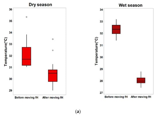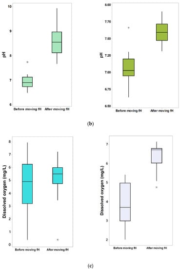 The temporal variations in water quality parameters such as pH, temperature, DO conductivity, and nitrate are shown by the box plots in Figure 3. According to the results of the box plots in Figure 3a, in the dry season, the temperature range before moving the floating houses was from 35.34 to 31.03 °C, with a mean value of 32.1 ± 1.16 °C, whereas after moving the floating houses, the temperature range was 33.44 to 29.01 °C, with a mean value of 30.5 ± 1.07 °C. Meanwhile, in the wet season, the temperature ranged from 33.2 °C to 31.4 °C, with a mean value of 32.34 ± 0.48 °C before moving the floating houses. After moving the floating houses, the temperature ranged from 28.8 °C to 27.43 °C, with a mean value of 28.04 ± 0.37 °C. The temperature significantly decreased after moving the floating houses (p < 0.05). The box plots show that the temperature trend before moving the floating houses in both the dry and the wet seasons was increasing. An increase in temperature leads to an increase in the reaction rate of chemicals in water, and dissolved oxygen decreases in water [23]. In warm water, the respiration rate of aquatic organisms increases, causing a higher consumption of oxygen; therefore, the growth of phytoplankton and bacteria doubles in the population as a result of macrophyte growth and algal blooms with the availability of nutrients [24]. Fifty-six genera of phytoplankton were identified in Tonle Sap Lake [25]. In the dry season, the nitrogen-fixing species Anabaena spp. and blue-green algae Microcystis dominated, whereas diatom species, mainly Aulacoseira granulate, dominated in the wet season. When comparing the box plots for the two conditions, it was revealed that the temperature significantly decreased after moving the floating houses. When there is a low temperature, the solubility of oxygen in water increases considerably [26]. Therefore, the temperature condition after moving the floating houses was favorable for oxygen solubility. Moreover, the increasing temperature can cause an increase in suspended solids [27]. The suspended solid concentration is strongly correlated with the turbidity of water [28]. This point clearly shows that the water was more polluted before moving the floating houses than after moving the floating houses.