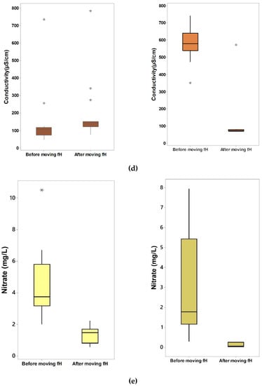 According to the box plot results shown in Figure 3d, the range of conductivity before moving the floating houses was from 735 to 47 µS/cm, with a mean value of "135 ± 156 µS/cm but the range after moving the floating houses was from 783 to 76.1 µS/cm, with a mean value of 187 ± 160.4 µS/cm in the dry season. In the wet season, the conductivity ranged from 742 to 350 µS/cm, with a mean value of 581 ± 89 µS/cm before moving the floating houses, whereas after moving the floating houses, the range of conductivity was from 572.6 to 68.7 µS/cm, with a mean value of 102 ± 118 µS/cm. These box plots show that in the dry season, even after moving the floating houses, the conductivity was slightly higher. Agricultural runoff and a failing sewage system that releases chloride, phosphate, and nitrate can increase conductivity [29]. Therefore, there was a contribution of a large amount of agricultural runoff into the water after moving the floating houses in the dry season. Moreover, the conductivity box plots show that the data before moving the floating houses had a larger spread than those after moving the floating houses. However, the conductivity was significantly decreased after moving the floating houses, which reveals that there was less water contamination after moving the floating houses in the wet season.