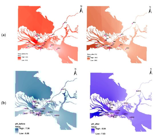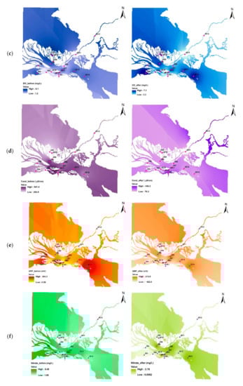 The spatial variation in the water quality parameters is shown in Figure 4. The results of the pH reveal that the pH slightly decreased at floating house sites JS6 and JS9 after moving the floating houses, as shown in Figure 4a. However, the sampling site JS3 in the condition after moving the floating houses showed the highest pH among the sites since JS3 is close to the agricultural land and the discharge from the agricultural land contributed to that site, leading to the highest pH value [30,31,32]. Moreover, from the temperature interpolation sites, only sampling site JS3, which is near agricultural land, had a high temperature after moving the floating houses, as shown in Figure 4b. The temperature variations in the other floating house sites of JS6 and JS9 and the wetland area of JS12 resulted in decreasing temperature values. After moving the floating houses, the dissolved oxygen concentrations in the study area improved, as shown in Figure 4c. However, some floating house sites, such as JS1, JS18, and JS16, which are near Chhnok Tru Port, still had low dissolved oxygen concentrations. According to the conductivity maps shown in Figure 4d, the conductivity of the study area decreased after moving the floating houses. The ORP spatial contributions, as shown in Figure 4e, also show that the study area became less contaminated after moving the floating houses. However, a negative ORP value was also found near Chhnok Tru Port. These ORP results indicate that there was high water contamination even after moving the floating houses, showing that there was still discharge from other point sources and nonpoint sources. Moreover, nitrate concentrations in the study area were reduced after moving the floating houses, as shown in Figure 4f.