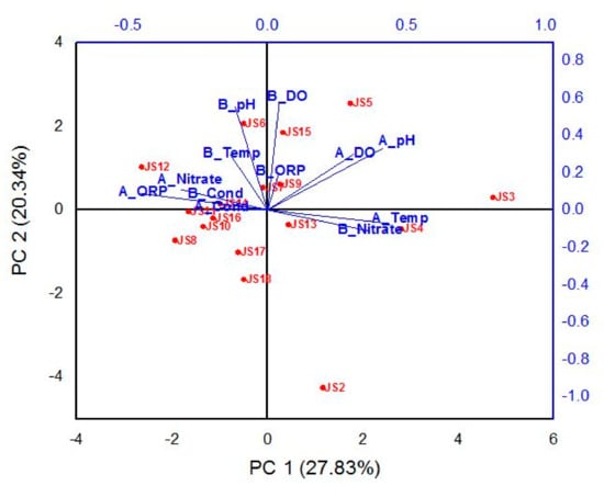 In the biplot results shown in Figure 5, the water quality parameters before moving floating houses are labelled as B_Temp for temperature, B_pH for potential hydrogen, B_DO for dissolved oxygen, B_cond for conductivity, B_ORP for oxidation-reduction potential, and B_Nitrate. Meanwhile, A_Temp, A_pH, A_DO, A_Cond, A_ORP, and A_Nitrate are used as the abbreviations for the respective water quality parameters after moving the floating houses. PC1 explained 27.83% of the variance and PC2 explained 20.34%. PC2 had a strong loading on temperature before moving the floating houses, mainly at JS6 and JS7. After moving the floating houses, PC1 had a strong loading on temperature, mainly at sites JS2 and JS13. This result shows that before and after moving the floating houses, the variation in temperature was mainly contributed to by these respective sites. Moreover, PC2 had a strong loading on pH before moving the floating houses and contributed mainly to sites JS6 and JS7. However, after moving the floating houses, PC1 was strongly loaded on pH and mainly contributed to site JS3. Since the agricultural area is near JS3, the contribution from agricultural land affected the pH after moving the floating houses. PC2 had strong loading on DO before moving the floating houses, mainly at sites JS15 and JS5, whereas after moving the floating houses, PC1 had strong loading on DO, mainly at sites JS4, JS3, JS5, JS9, and JS14. Besides, PC2 had weak loading on conductivity, mainly at sites JS7, JS6, and JS12, whereas after moving the floating houses, PC2 also had a weak loading on conductivity, mainly at sites JS7, JS6, and JS12. From these conductivity results, there was no temporal shifts in conductivity before or after moving the floating houses. This result reveals that agricultural runoff and other nonpoint sources also contributed to the study area. For ORP, PC2 had weak loading on ORP, mainly at sites JS9, JS15, and JS5, whereas PC1 had strong negative loading on ORP after moving the floating houses, mainly at sites JS12, JS6, and JS7. Before moving the floating houses, PC1 had a strong loading on NO3−, mainly at sites JS4, JS13, and JS2, whereas PC2 had a weak loading on NO3−, mainly at sites JS12, JS14, and JS1. Overall, B_temp, B_ pH, and B_DO had strong positive loadings on PC2 and A_Temp, A_pH, and A_DO had strong positive loadings on PC1. Therefore, for these PCA results, the temporal shifts in water quality parameters before and after moving the floating houses were enhanced. Thus, moving the floating houses affected some of the basic water quality parameters studied, whereas some were not affected.