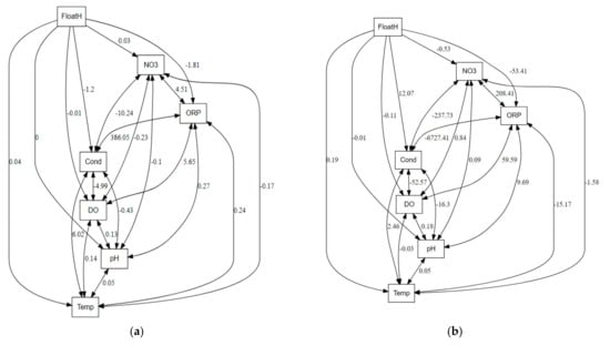 The path diagrams from SEM was evaluated to describe the direct effect of the floating houses on water quality before and after moving the floating houses, as shown in Figure 6a,b. As shown in Table 3, before moving the floating houses, 91% of the floating house distribution had a direct positive effect on pH, and after moving the floating houses, only 4% of the floating houses had a direct positive effect on pH. These results indicate that pH increased under both conditions of floating house distribution. However, there were no statistically significant effects of the percentage of floating houses on pH. Moreover, 91% of the floating house distribution had a statistically significant direct positive effect on temperature (C.R > ±1.96), whereas a 4% floating house distribution also had a statistically significant positive effect on temperature (C.R > ±1.96). These results show that the floating house percentage distribution had a significant effect on the temperature. According to the results of the floating houses’ effect on DO, the 91% floating house distribution had a direct negative effect on DO, and the 4% floating house distribution also had a negative effect on DO. These results show that DO decreased under both conditions of floating house distributions. This result proves that the dissolved oxygen concentration was also impacted by natural factors and other nonpoint sources [17,33]. However, there was no statistically significant effect of floating house percentage on DO. For conductivity, the 91% floating house distribution had a negative effect on conductivity, whereas the 4% floating house distribution had a positive effect on conductivity. Based on these results, other factors such as agricultural runoff also could have affected conductivity [17,28,33,34,35,36]. However, there was no statistically significant effect of the floating house distribution percentage on conductivity. For ORP, the 91% floating house distribution had a negative effect on ORP, and the 4% floating house distribution also had a statistically significant negative effect on ORP. The 91% floating house distribution had positive effect on NO3− before moving the floating houses, whereas the 4% floating house distribution had a negative effect on NO3−. There was no statistically significant effect of the floating house distribution percentage on NO3−.