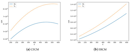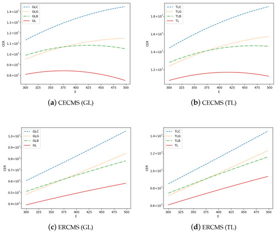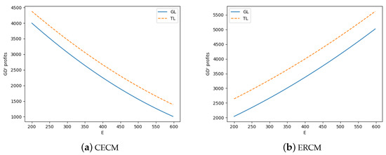 In addition to analyzing the impact of mandatory green standards on market share, we also analyze how mandatory green standards affect carbon emission reduction and GD’s profits in different situations. Due to the complexity of the analytical solutions, we demonstrate results through a series of numerical experiments. Figure 1 provides the carbon emission reduction in four models, where we assume that , in CECM (Figure 1a), , in ERCM (Figure 1b), , , , and E in the range of . Here, we define the carbon emission reduction as product of emission reduction per unit area (E) and market demand (), which is