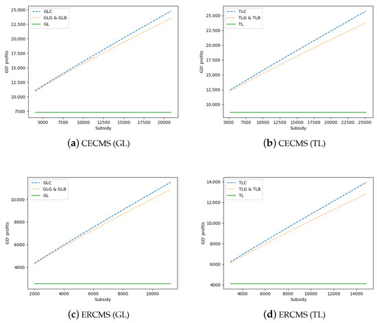Due to the complexity of the analytical solution, it is difficult to compare directly. We study the effect of subsidizing green consumers and subsidizing GD on GD’s profits with the same subsidy rate through a series of numerical experiments. One of the results is shown in Figure 3, where the parameters are set as , , , , , , in CECMS and , in ERCMS. The subsidy rate range is 10 to , and the result shows that when subsidizing green consumers, GD’s profits are much higher than that when subsidizing its costs with the same subsidy amount. Since the curves of subsidizing GD for the green cost and the basic cost completely overlap, when the subsidy amount is the same, the two subsidy methods of subsidizing GD have exactly the same impact on profits.
