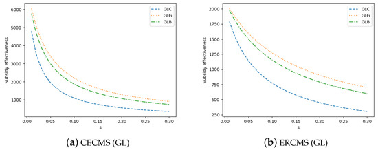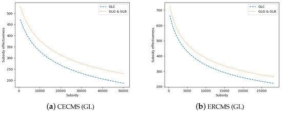 We compare the subsidy effectiveness of subsidizing green consumers and subsidizing GD through numerical experiments. We provide two perspectives: the same subsidy rate and the same subsidy amount. From the perspective of the same subsidy rate, results with the same parameters in Proposition 7 are shown in Figure 4 (taking GL as examples). The results show that the subsidy effectiveness of subsidizing GD is better than that when subsidizing green consumers. At the same time, comparing the two subsidies for GD’s cost provides evidence for Corollaries 3 and 5.