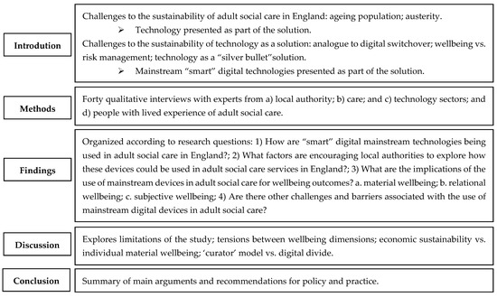This paper reflects on data collected as part of a project examining the potential of technologies to contribute to sustainable adult social care services and to wellbeing outcomes for those who receive support. Here, we focus on a particular area of emergent practice highlighted by our research: the use of mainstream technologies such as voice assistants, smart speakers, “wearables” (e.g., smart-watches, activity trackers), and other Internet of Things-enabled (IoT) devices [55] (Appendix A, note 4). These increasingly ubiquitous devices—in 2020, there were an estimated 10 Internet-enabled devices per household in the UK [56]—could be seen to represent Doughty et al.’s [32] third generation of telecare, which they predicted would utilize broadband and wireless technology to connect users to a “virtual neighbourhood” including health and social care professionals and facilitate social engagement. The aim of this paper was to provide insight into this nascent area of practice and research by elucidating the ways mainstream technologies are being deployed by English local authorities, the catalysts for their use, and their associated implications—including their potential to contribute to wellbeing outcomes and therefore sustainability—to identify key areas of learning. The paper is organized as per Figure 1 and addresses four questions: