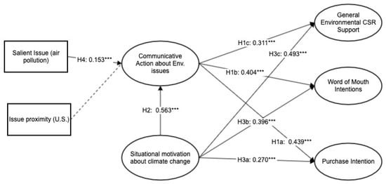 Next, H3 predicted positive relationships between the situational motivation for climate change and CSR outcomes. There were direct positive relationships between situational motivation and purchase intentions (b = 0.270, p < 0.01), positive word-of-mouth communicative intentions (b = 0.396, p < 0.01), and general CSR-supportive intentions (b = 0.493, p < 0.01). The results indicated that individuals with higher motivation to solve the problem of climate change are more likely to support ECSR programs through positive word-of-mouth and purchase intentions.
